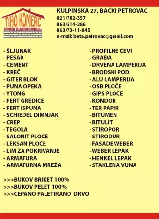Ako vam je potrebno građevinsko materijale i drvo u Bačkom Petrovcu, kontaktirajte nas za dodatne informacije o cenama i uslovima isporuke. Tu smo da vam pomognemo da vaš projekat ide glatko i efikasno.